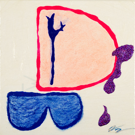 Acrylic, crayon, glue, and holographic glitter on canvas.