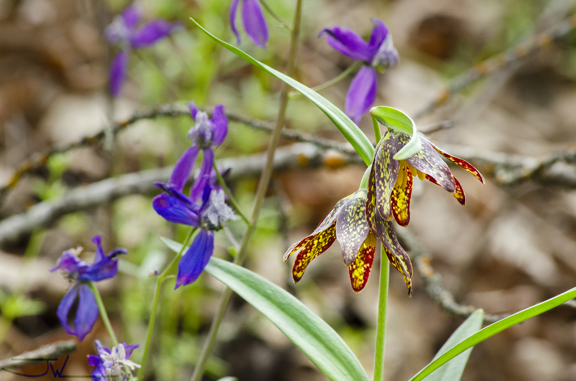 Fritillaria affinis, with its intricate markings, proudly stands in the foreground, capturing one’s gaze, while the subtle presence of Delphinium glareosum delicately adorns the scene behind. The harmonious interplay of these botanical wonders speaks to the rich tapestry of nature’s creations.