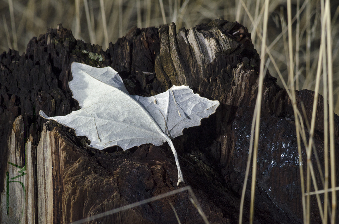 An ash soaked leaf from last summers wildfires on a broken telephone pole.