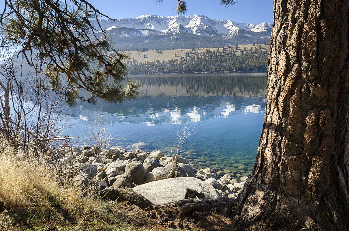 Chief Joseph Mountain and its reflection on Wallowa Lake, framed by trees.