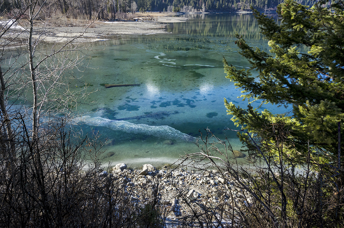A Thin Layer of Ice on Wallowa Lakes South End A late winter image of a slightly frozen Wallowa Lake framed between trees.
